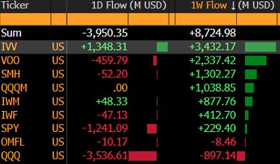 Down those same lines, we note that even if CNN’s market-data based indicator is flashing ‘extreme fear’ this is not necessarily how investors reacted during last week’s sell-off. The table below shows in- and out-flows into some of the most popular (US) equity ETFs, suggesting some healthy buying the whole week, with maybe a little of capitulation on Friday: