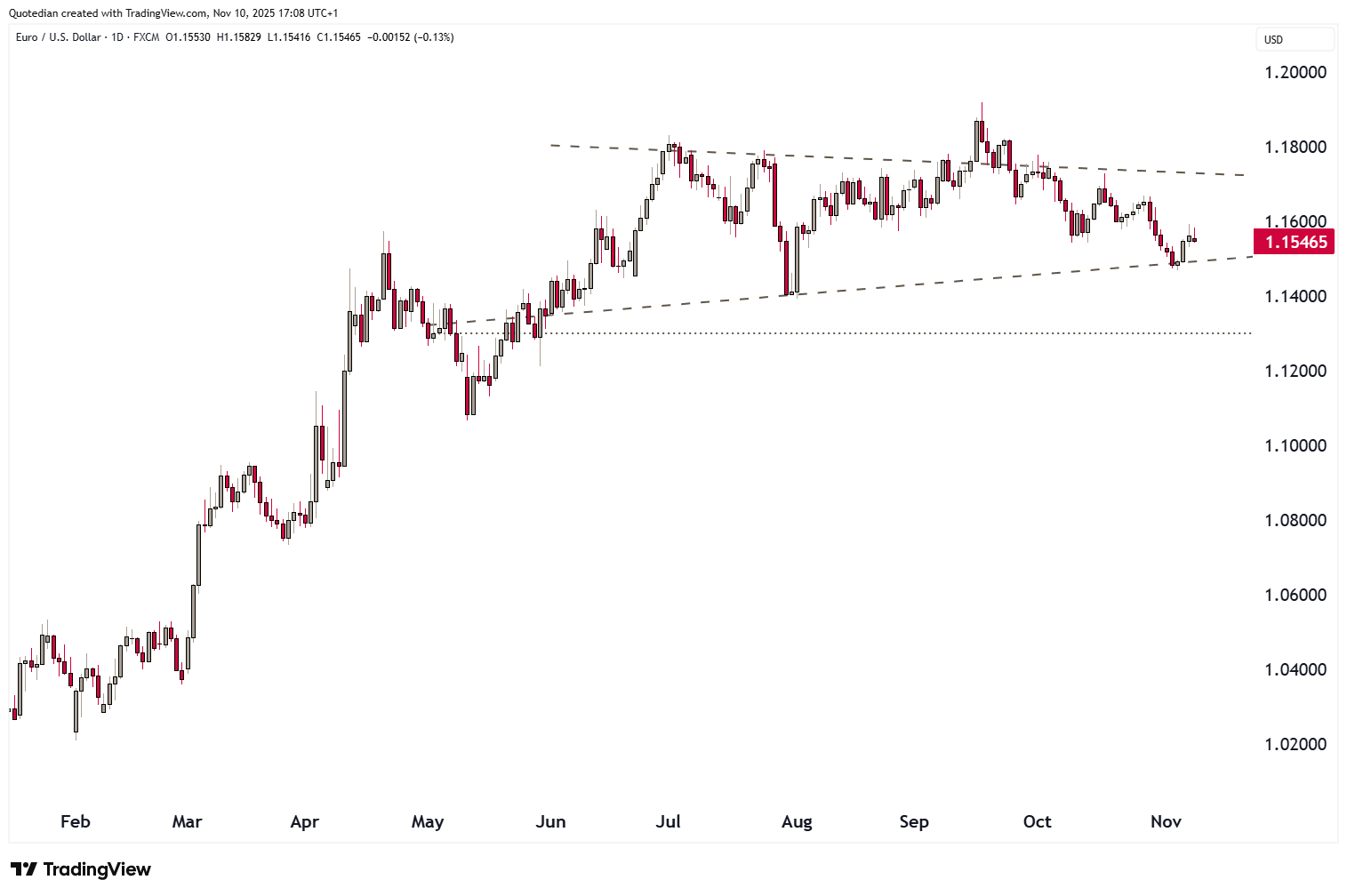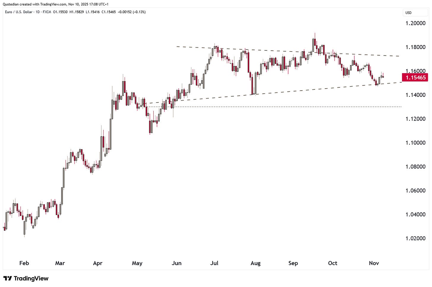 The EUR/USD cross also rebounded where it had to (dashed line), but even a break there would not make us bearish on the currency pair, unless 1.1300 (dotted line) gives: