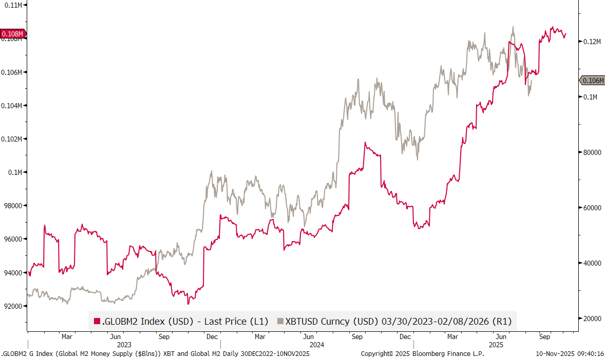 In the equity section above we showed a chart which made a bullish argument on Bitcoin, based on increasing global liquidity.