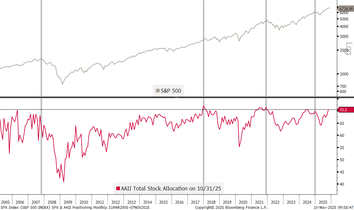 In stark contrast to this (short-term) sentiment indicator signalling fear amongst investors, stands the most recent monthly update of the American Association of Individual Investors (AAII - a retail investor association), which shows one of the highest allocation to stocks by retail investors over the past years: