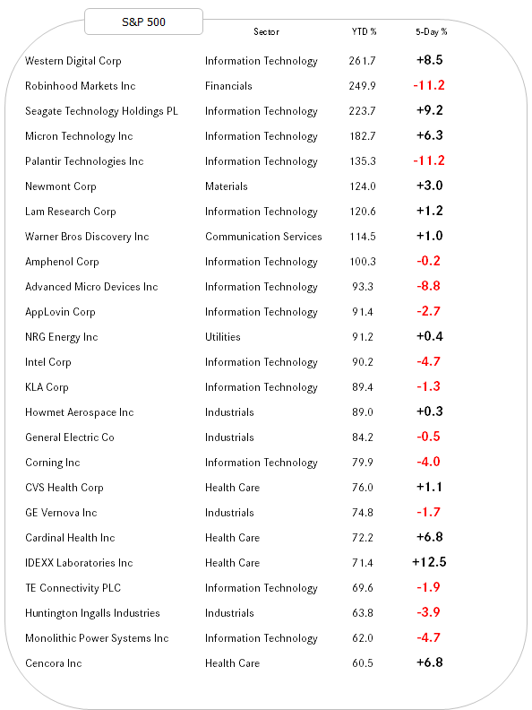 To wrap up the equity section for this week, here’s our usual glance at the best performing equities on a year-to-date basis and how they have fared over the past five sessions.
