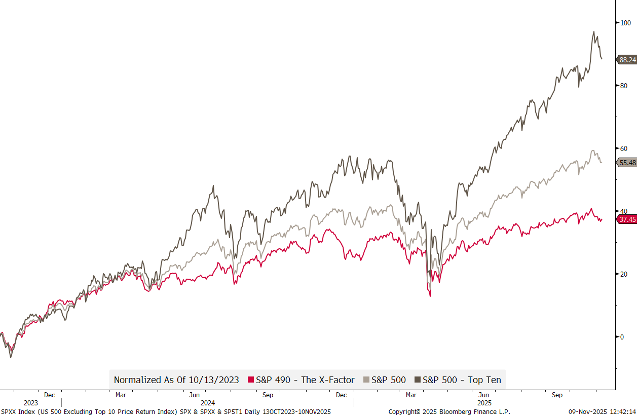 The red line is the S&P 500 excluding those top ten stocks, hence the S&P 490, or, let’s call it the X-Factor from now on …