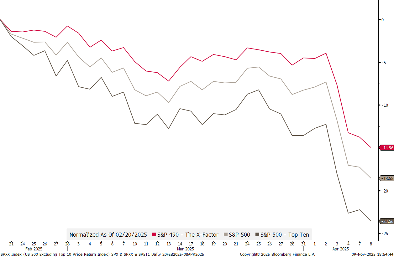 Let’s look at the that X-Factor again. Say, for however short-lived the effect was, you had switched from the top 10 stocks into the other 490 shortly a few weeks before Liberation day, just as the “war” drums started to be noisier, you would have done in relative terms, pretty well: