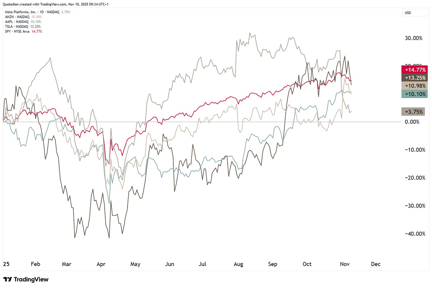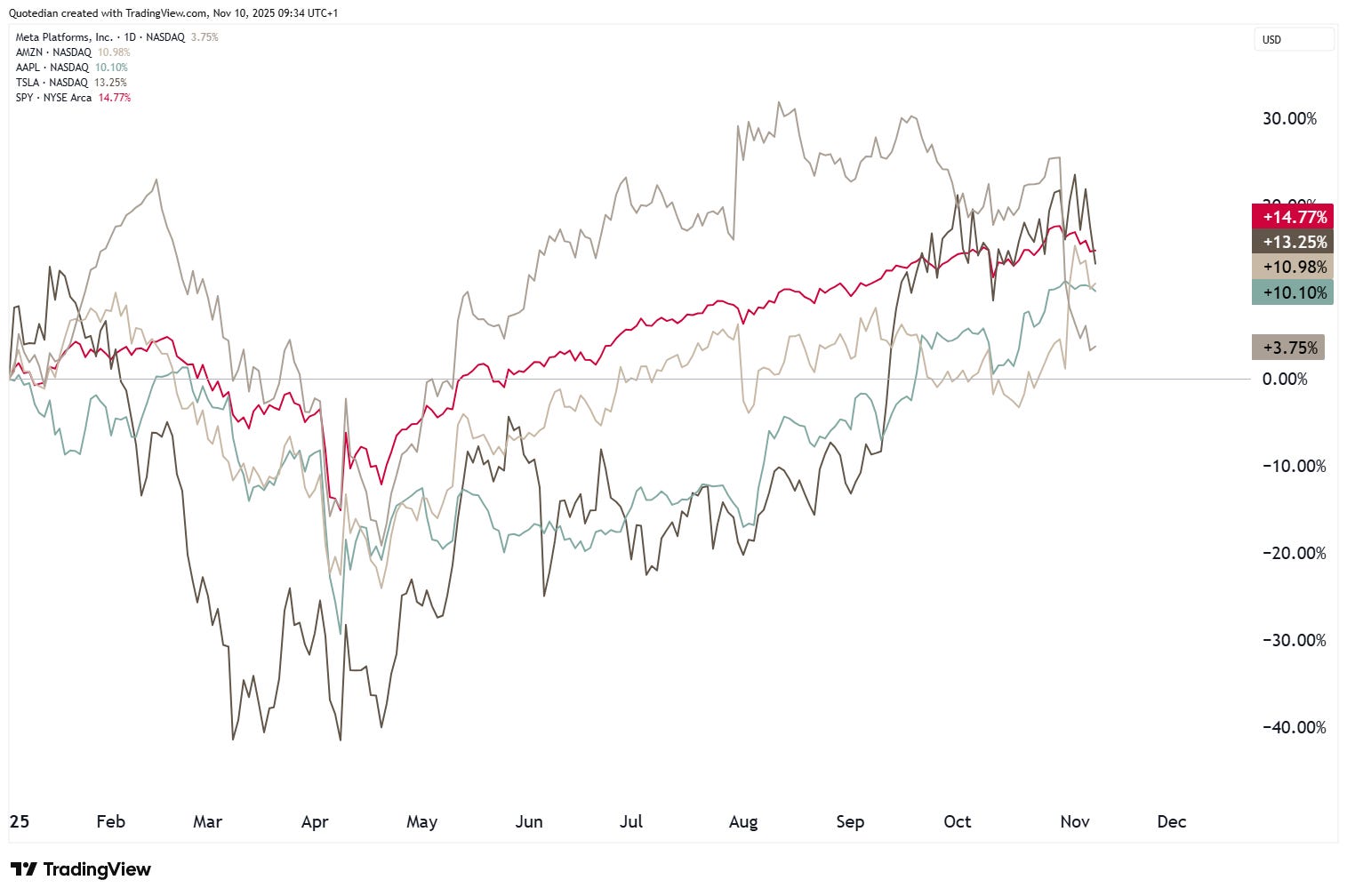 Maybe more of a tell-sign and an indication that switching to the X-Factor may not be the worst of ideas, is that of the Mag 7, four (AMZN, META, AAPL, TSLA) are performing less than the overall market (SPY, red) on a year-to-date basis: