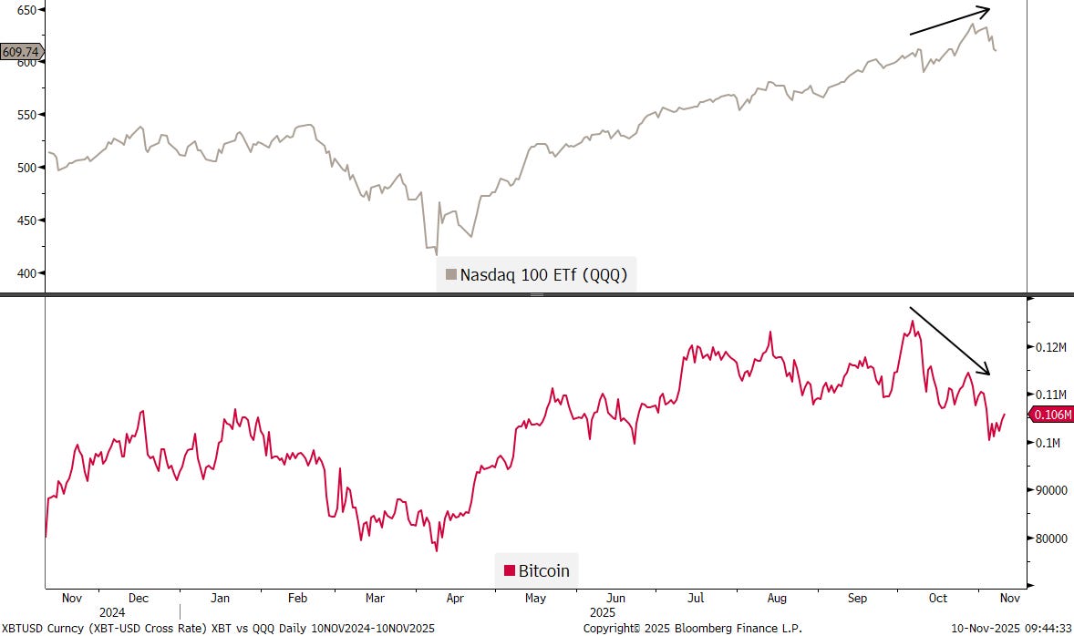 Bitcoin (BTC, red) had been warning via a divergence (arrows) of an impeding sell-off possibility in tech stocks (QQQ, grey):