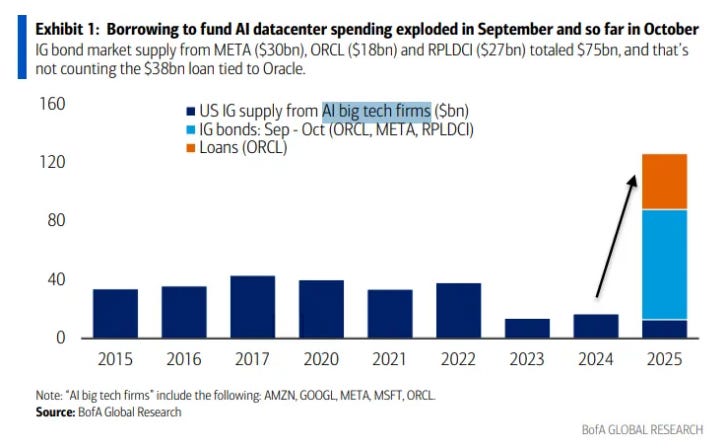 For example, consider this BofA chart, showing the pick-up in borrowing needs by some of the companies trying to be involved in the AI/data centre build out: