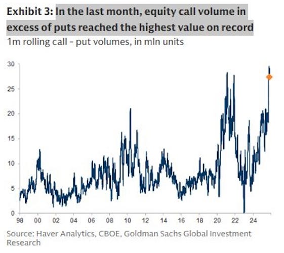 First, this call/put ratio chart from GS shows that investors are skewed towards call at one of the highest ratios ever: