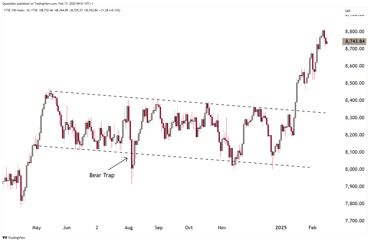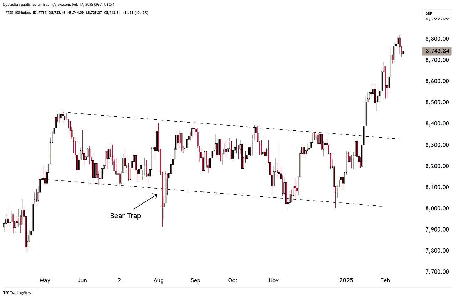 UK’s FTSE-100 index started a vertigo-inducing rally mid-January, lifting the index out of its nearly year-long sideways consolidation misery: