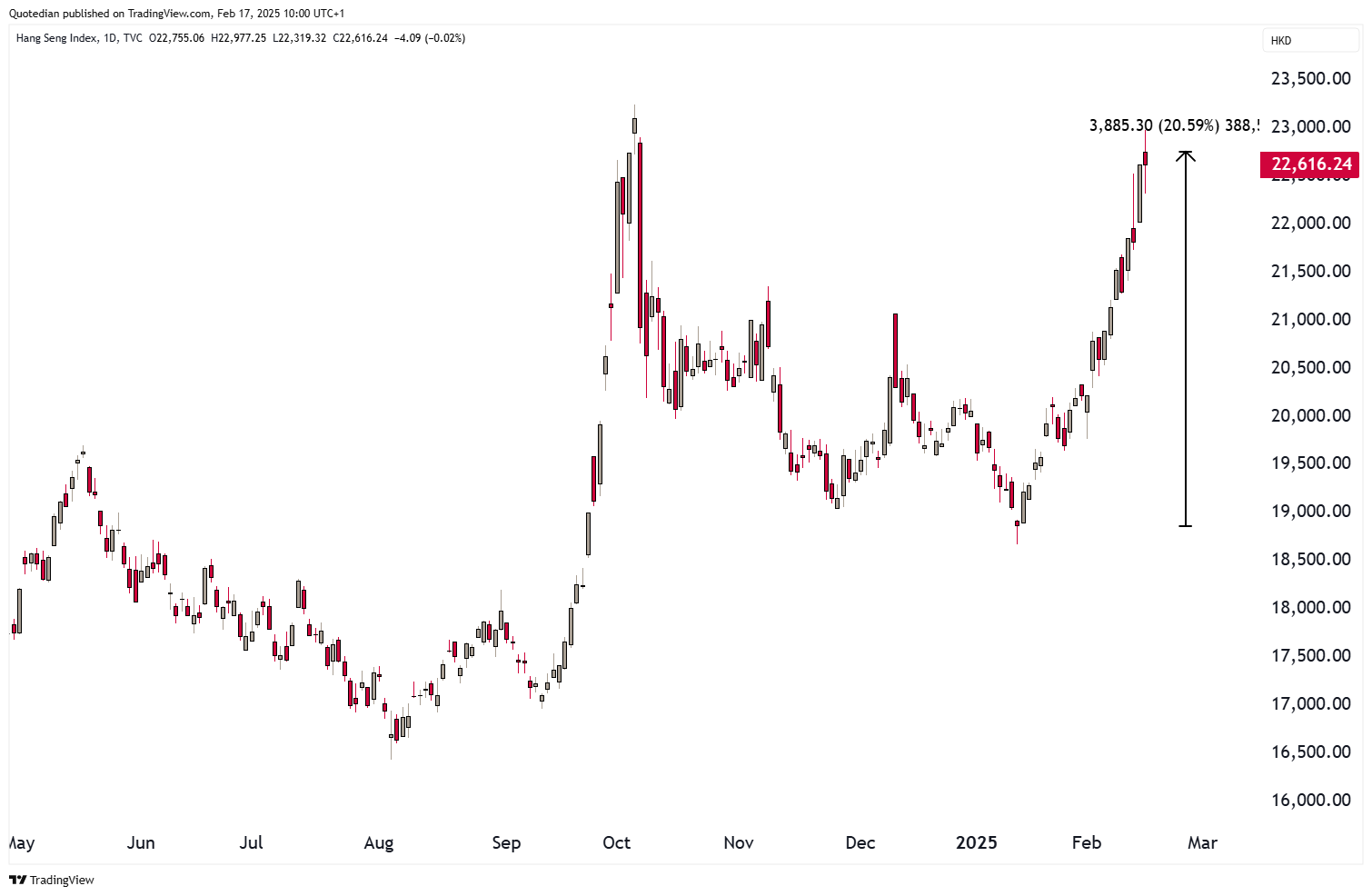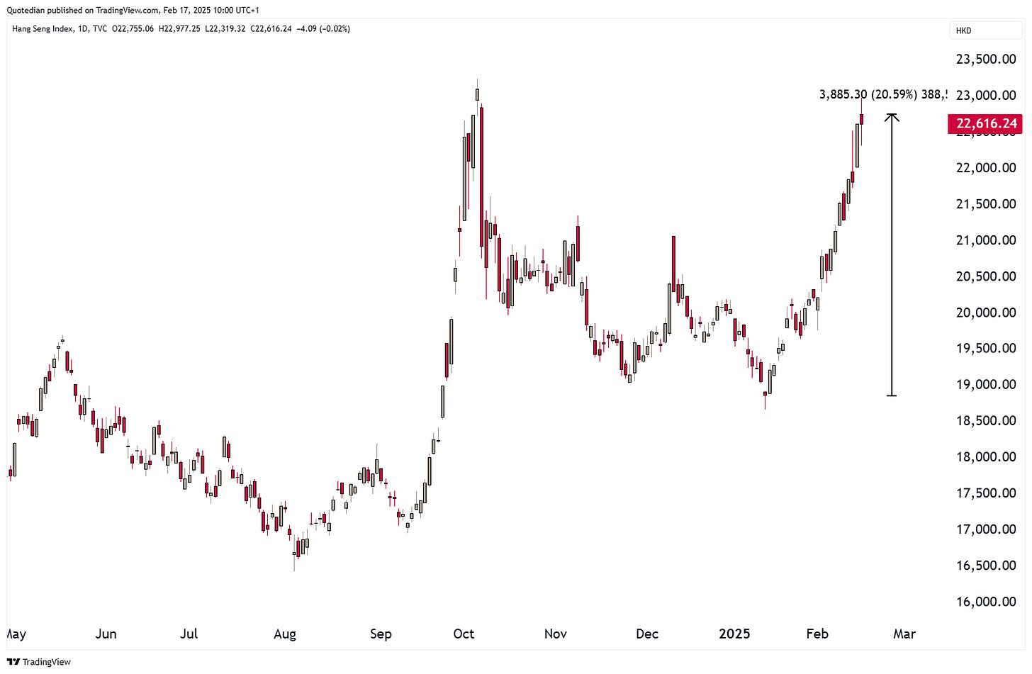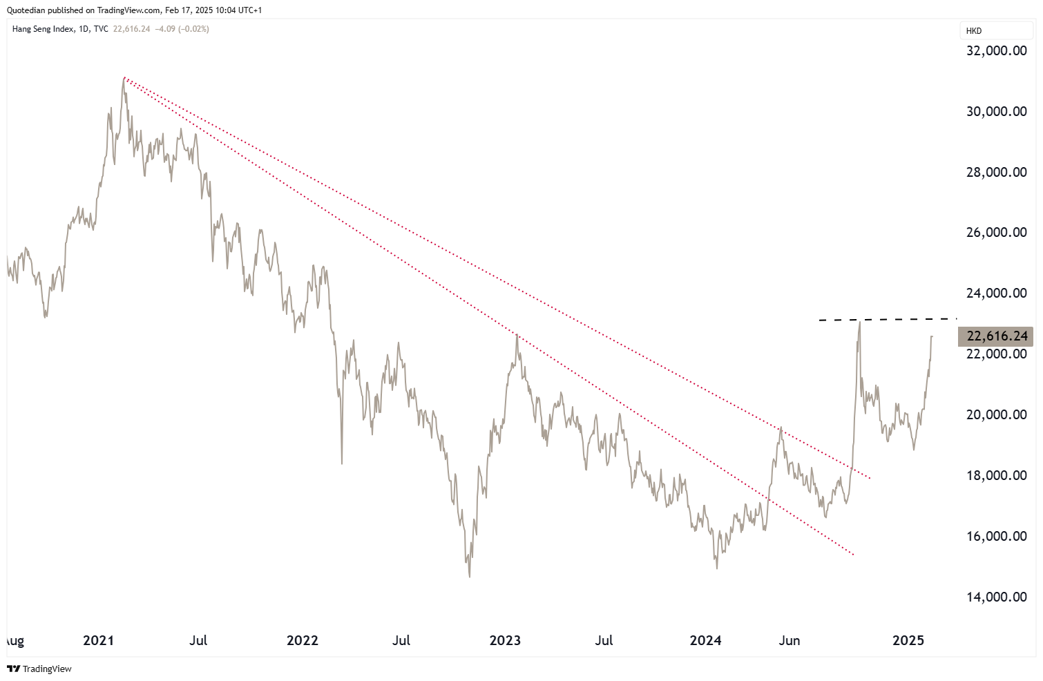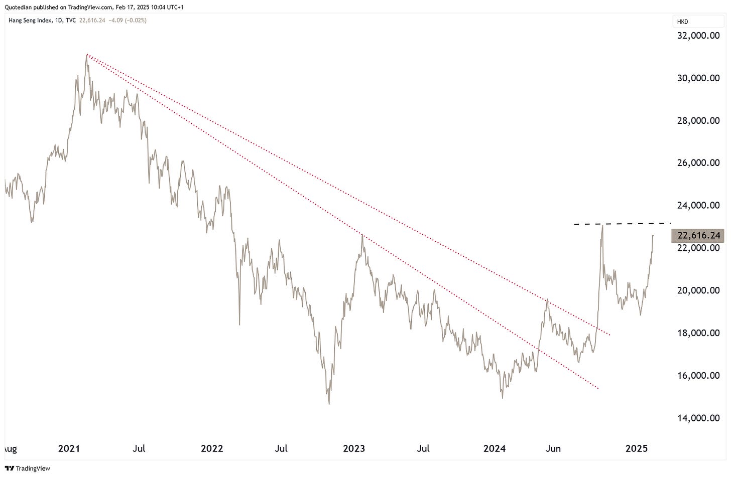 However, given the still existing “hate” for anything China, and the related “under owned”-ness of this market segment, a lift above 23,150 (black dashed line) could give additional legs to this rally: