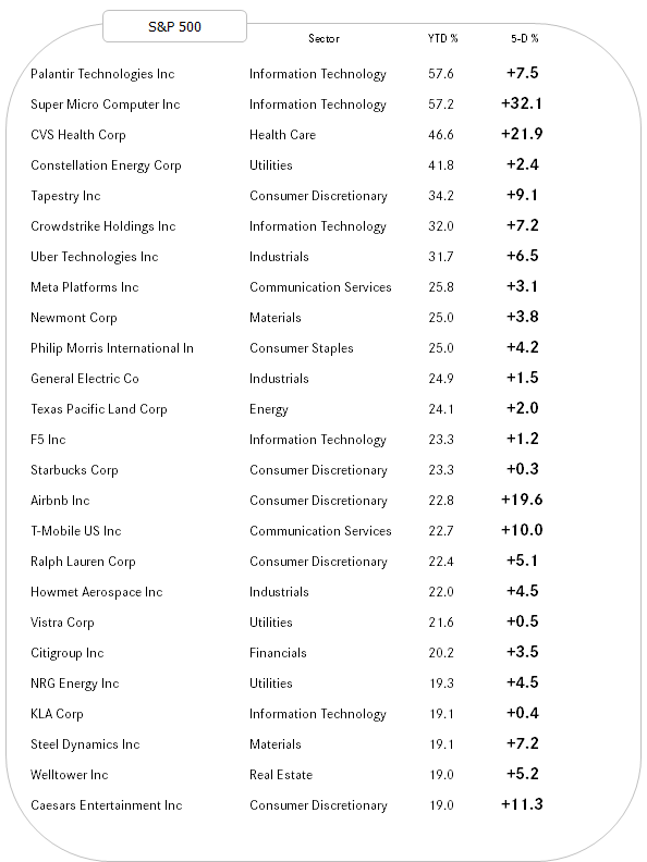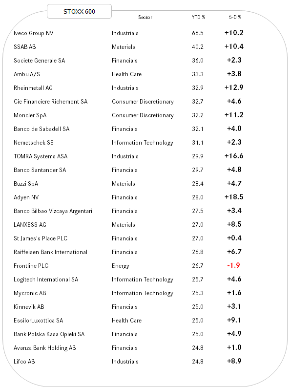 Strength begets strength and we observe that all best performing stocks have added further to their YTD gains last week. Probably also noteworthy that the list seems a tad less tech heavy than in the past.