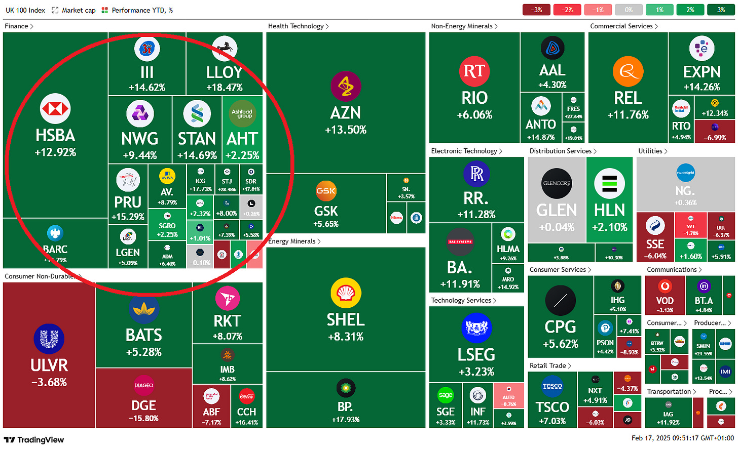 Only Utility stocks print a very small red, every other sector is showing positive readings, led by a flamboyant banking sector.