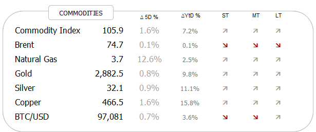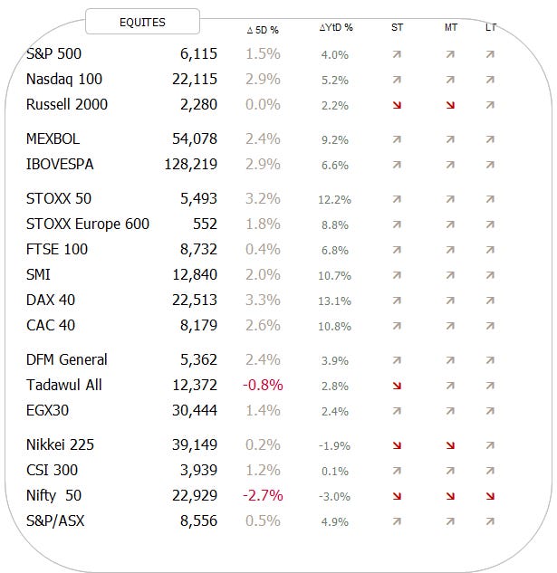 Starting with equities, we note that except the Indian stock market, all other major global indices are in long-term uptrends (foremost column to the right):