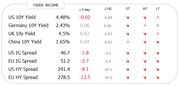Entering interest rate markets, we observe a) mixed trend signals for yield (top four lines in table below) and b) further contracting and down trending credit spreads: