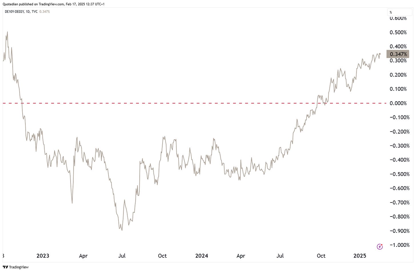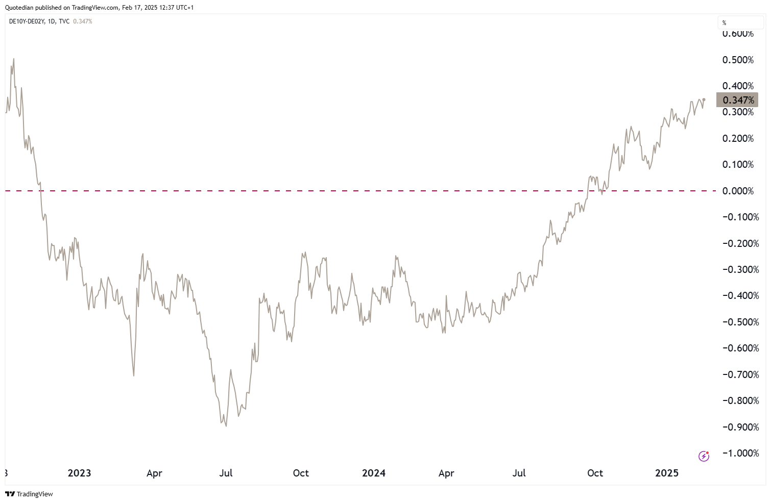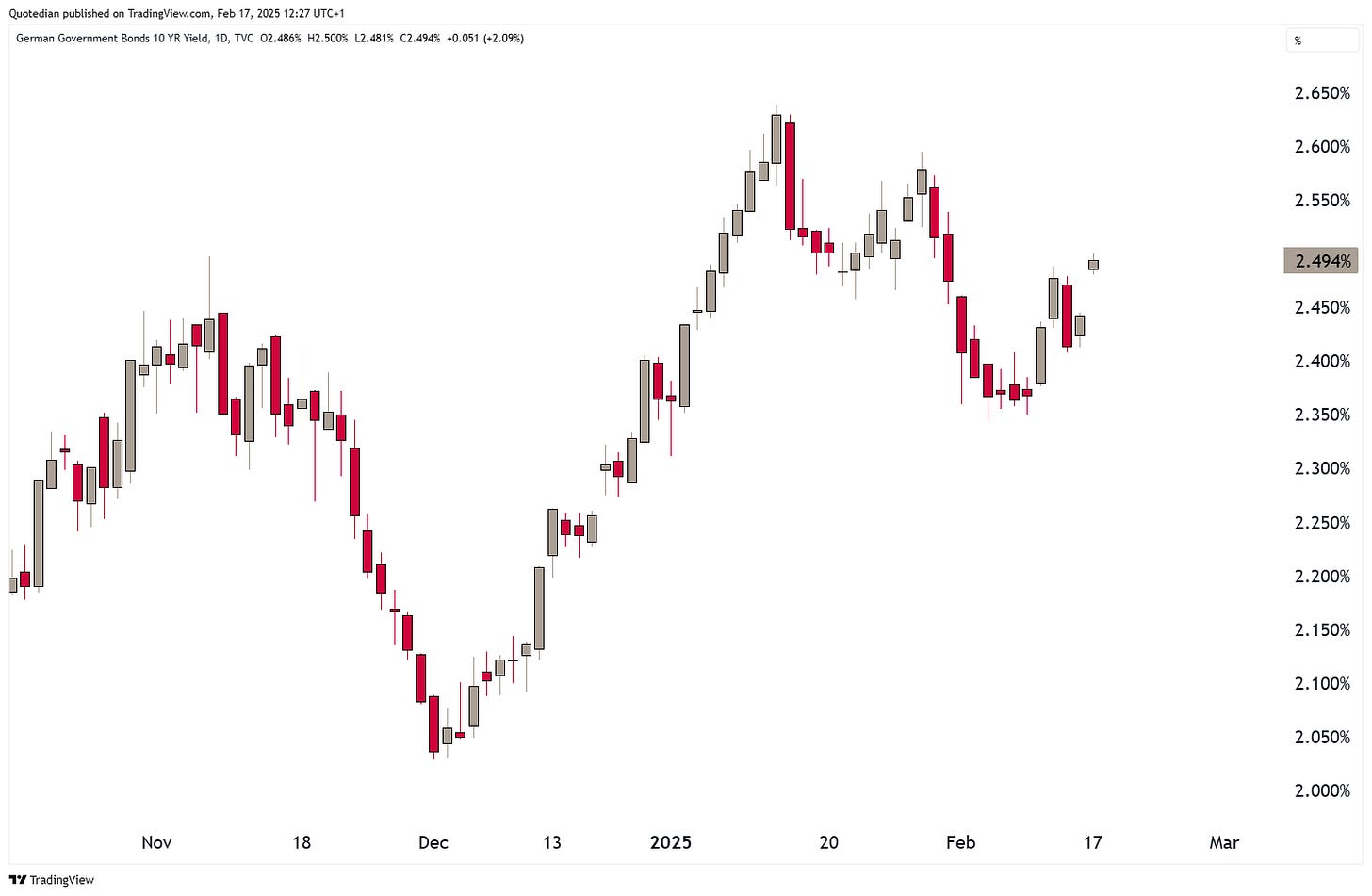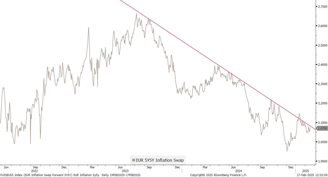 German yields as proxy for the Eurozone are sharply higher this Monday (17.2.) morning, as European leaders are emergency meeting in Paris today, to discuss increased defence spending as they fear being pushed into a disastrous deal. Here’s the 10-year Bund (nominal) yield: