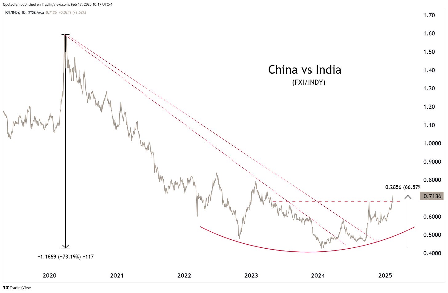 In last Thursday’s QuiCQ (click here), I even ventured into heretics, suggesting that the long China (FXI), short India (INDY) trade may still have legs: