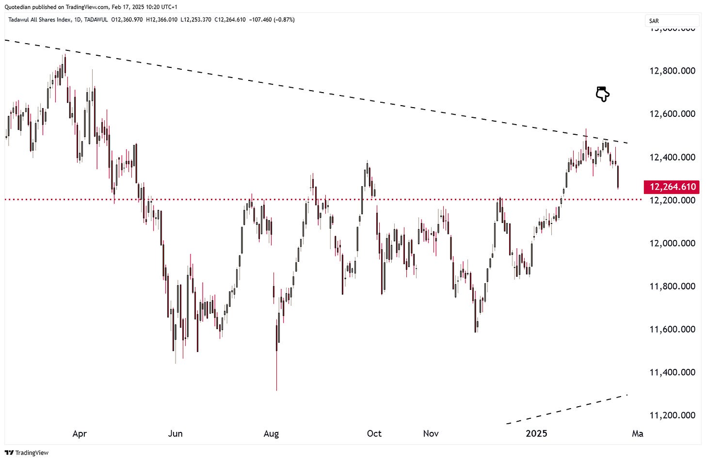 Zooming in, we note that 12,200 would be a good level for the correction to end: