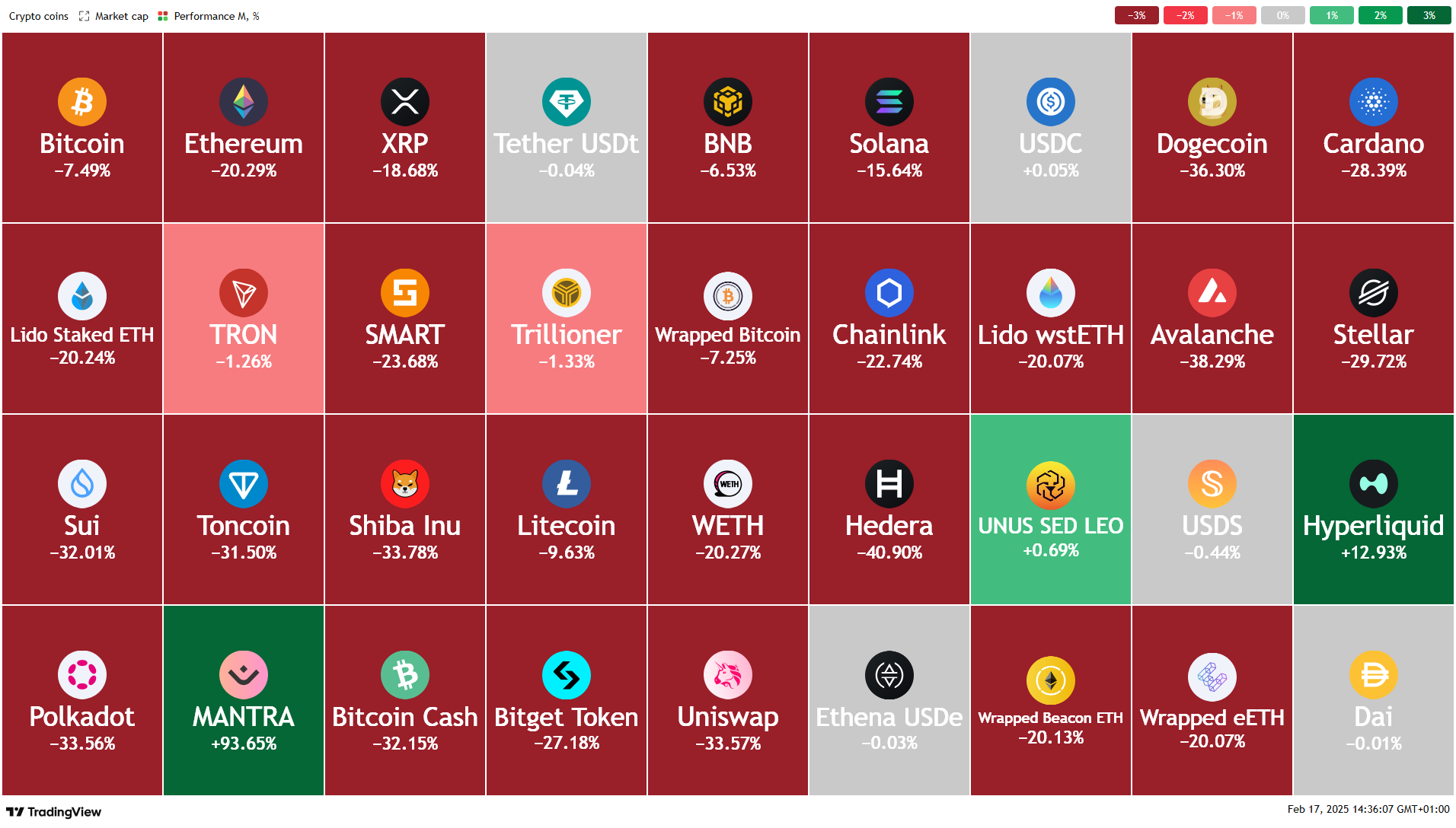And finally, cryptocurrencies seem to have gone into some consolidation mode, as the heatmap of monthly performance of cryptocurrencies with a market cap >$4.7bn shows: