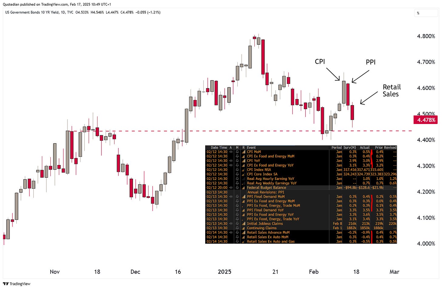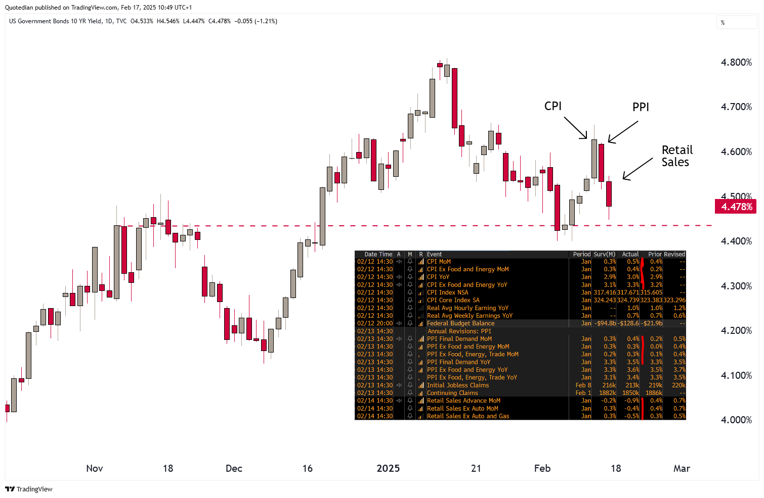 US bond yields had a strange week last week. First a hotter-than-expected CPI reading on Wednesday provoke a bond yield rally, bond price sell off. So far so good. However, the PPI reported on Thursday, which also carried a negative surprise to the upside, provoked exactly the opposite price reaction to the previous day. Then on Friday, retail sales reported were softer-than-expected, provoking more downside for yields. At least, that was the correct move again: