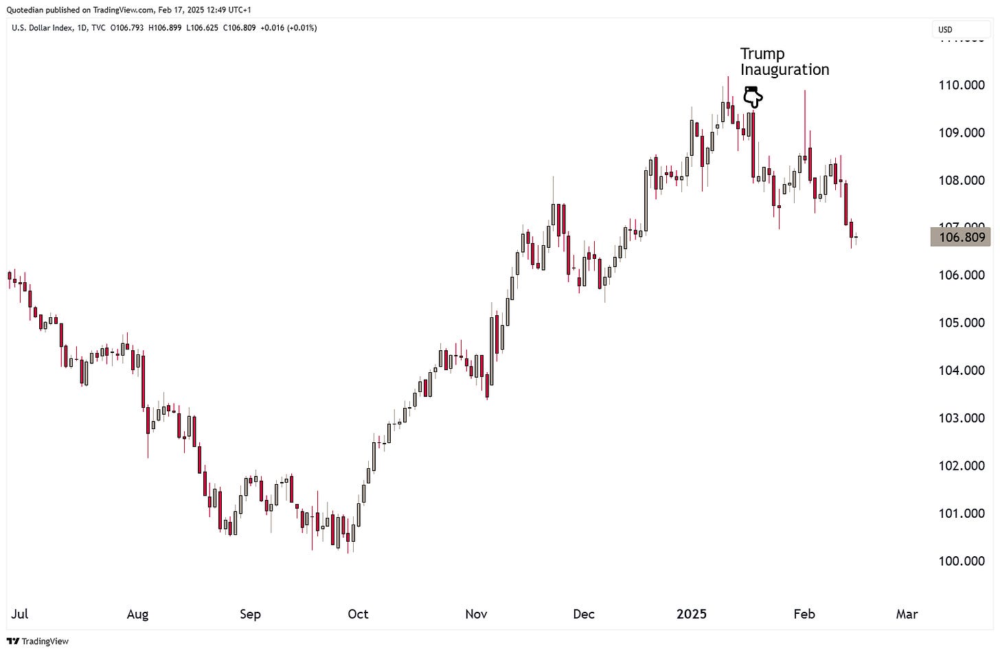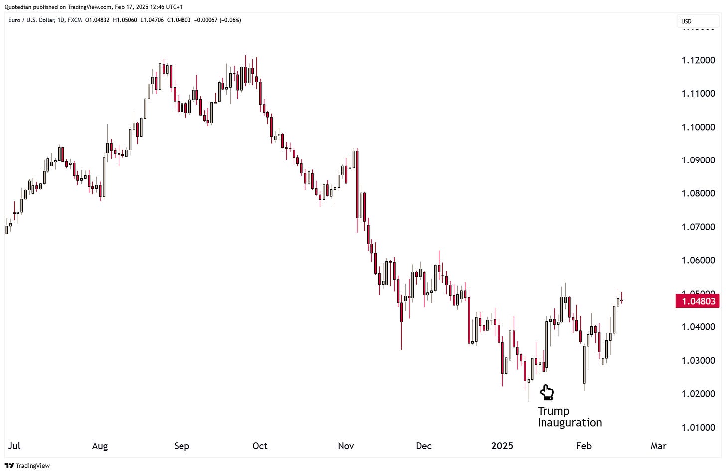 Looking at some charts and starting with the EUR/USD chart, we note that the Dollar found a top (EUR a bottom) on exactly inauguration day: