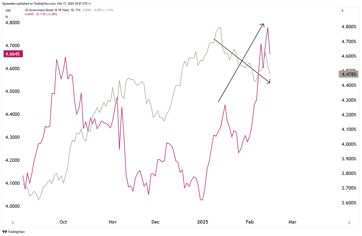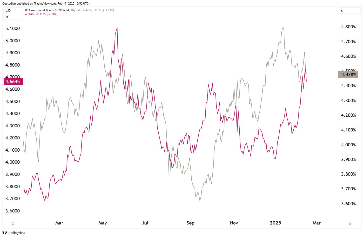 Last Thursday’s and Friday’s weakness observed on yields (grey) is somewhat at odds with what has been going on in the price of copper (red) recently:
