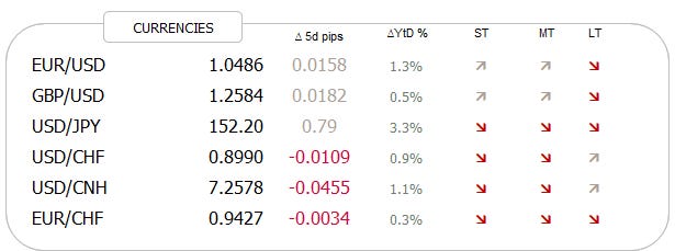 Recent Dollar weakness has changed the direction of the short- and intermediate trend arrows, though the long-term trend remains up for the Greenback for now (ex versus the JPY):