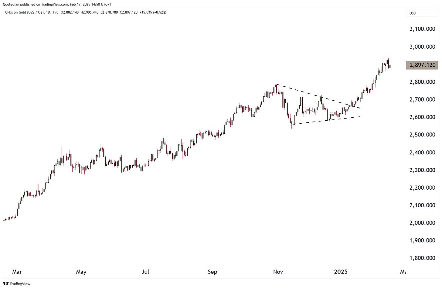 Gold has been pushing relentlessly higher and even though it trades below $2,900 at the time of this writing, the immediate price objective remains somewhere between $3,080 and $3,150:
