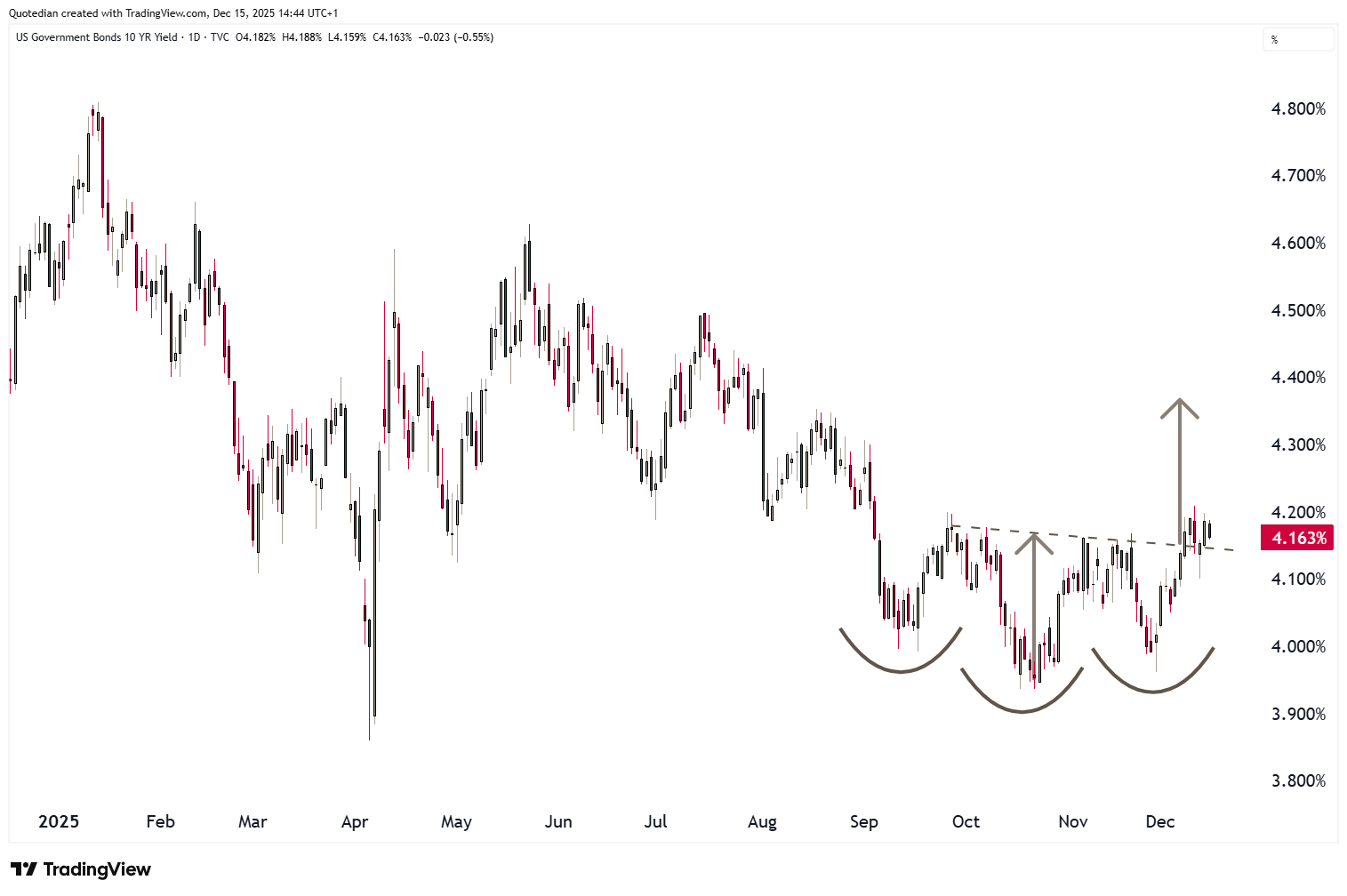 Taking a closer look at the US 10-year Treasury yield, we note that the inverted shoulder-head-shoulder pattern is still valid and counts for a measured move to 4.40ish: