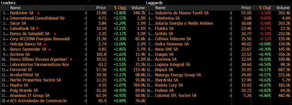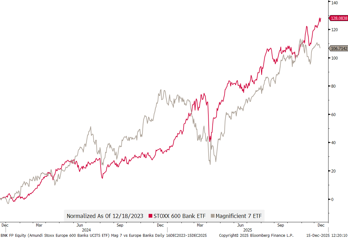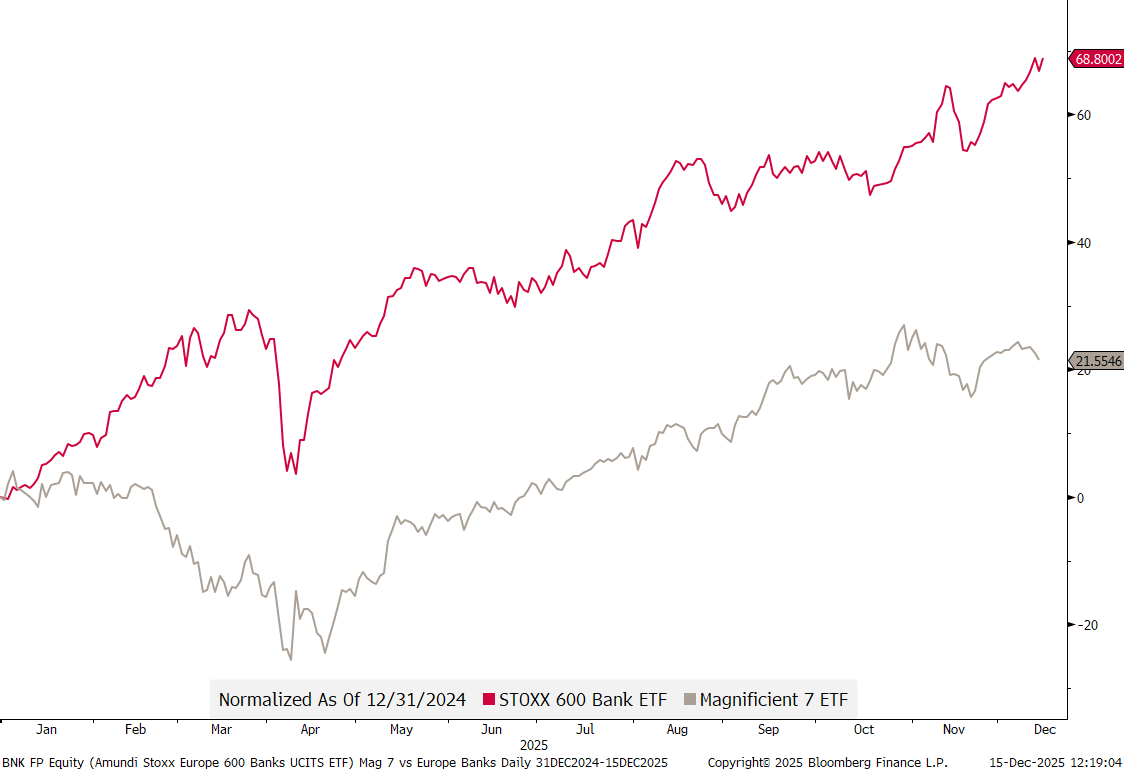 And talking of banks, European banks stocks (red line) continue to beat the Mag 7 (grey line) performance by a wide margin, not only this year,