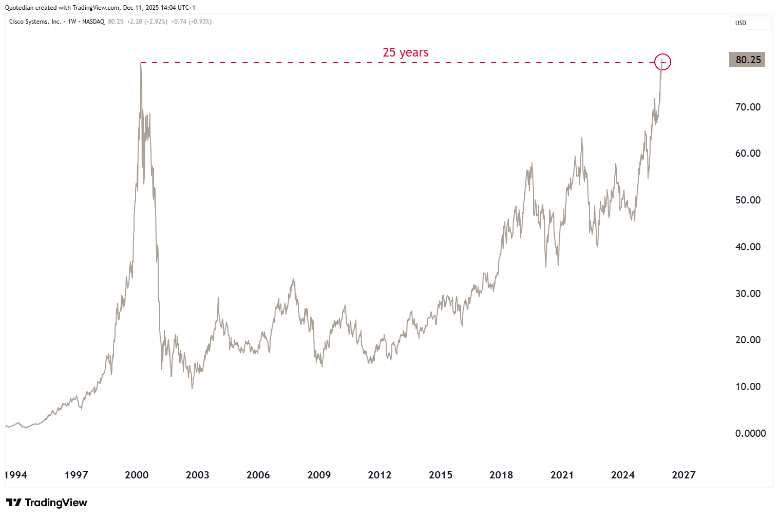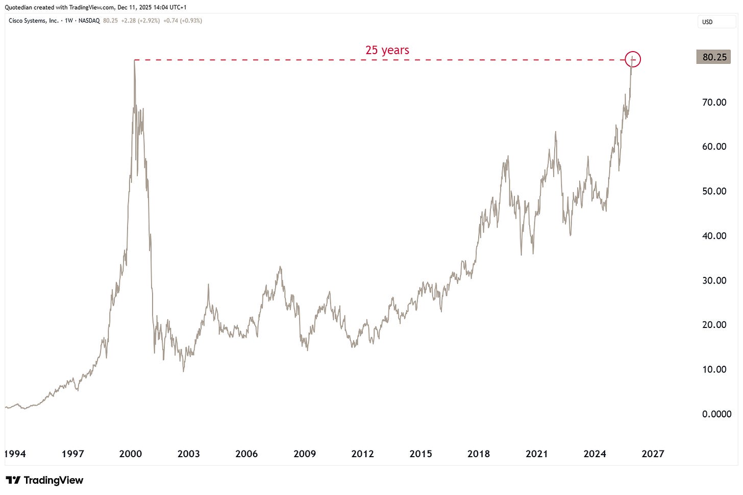 Twenty-five years later, Cisco Systems (CSCO), a internet networking company some of you may remember, hit a new all-time high this week: