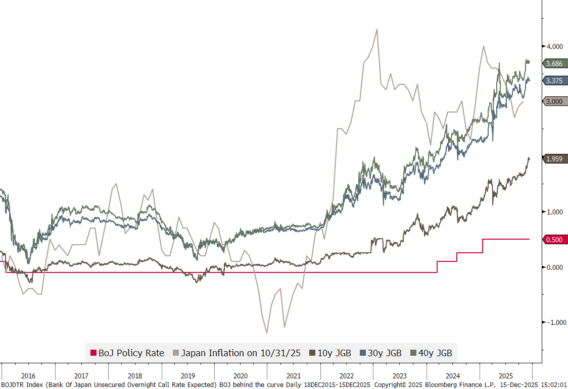 Of course, is the Bank of Japan (BoJ) which is still shell-shocked from three decades of deflation, wwwwaaaayyyyy behind the curve with their interest rate policy (red):