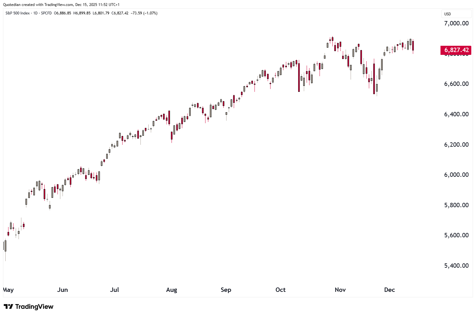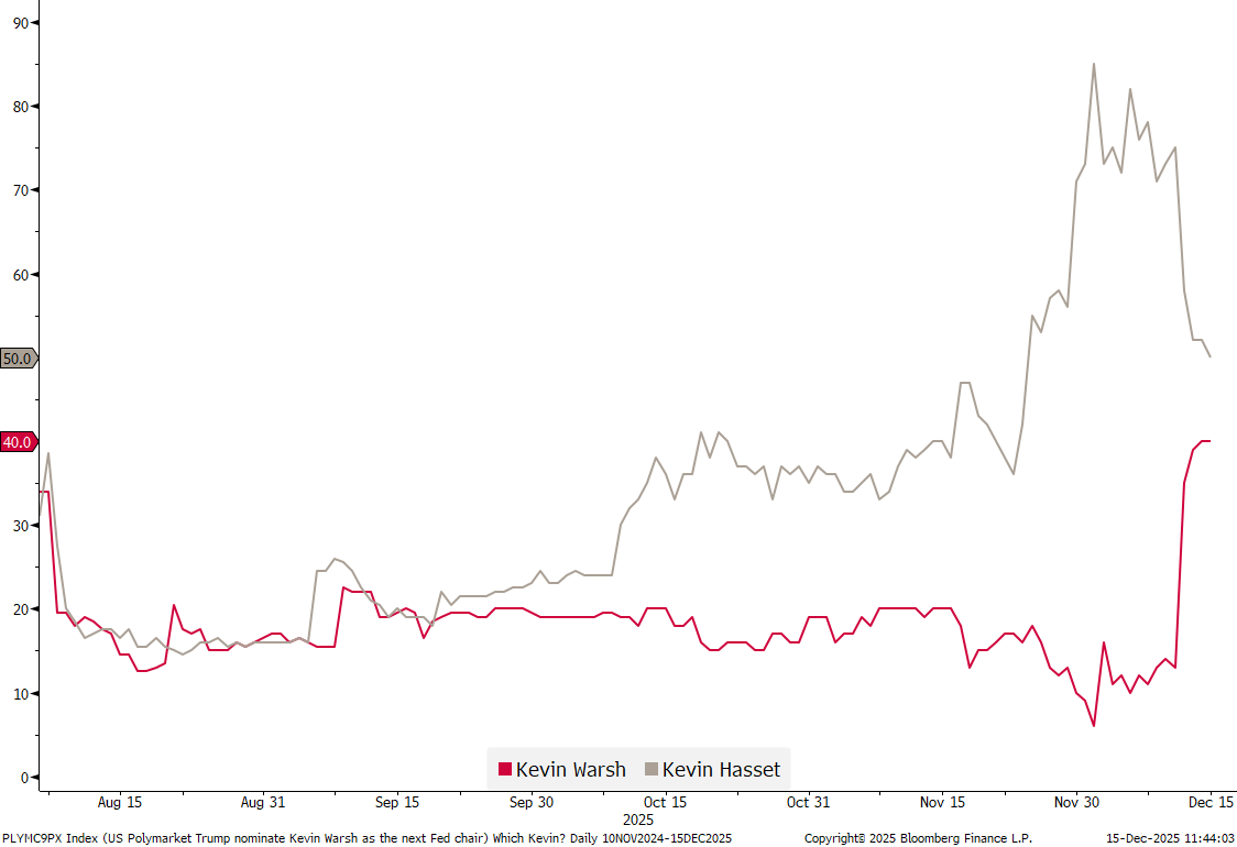 Stocks rallied last week on pre- and post-FOMC meeting, where a hawkish cut was expected, but a dovish cut delivered. Nevertheless, fortunes for equity investors turned quickly lower on Friday, after President Trump unexpectedly brought back Kevin Warsh into the Fed Chair race. Here’s the Polymarket betting chart on who the next Fed Chair will be: