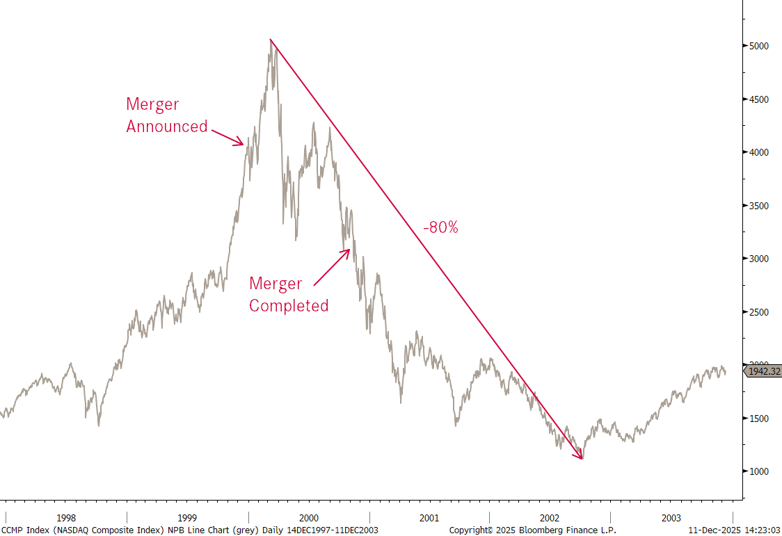 I couldn’t find a chart on AOL Time Warner anymore, as the fate of the company was eventually to be swallowed up by others, but the Nasdaq Composite serves as a valid proxy: