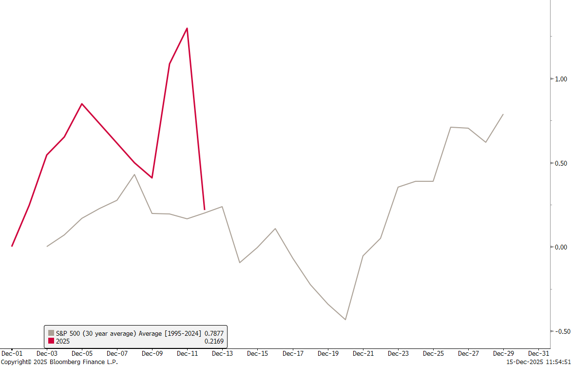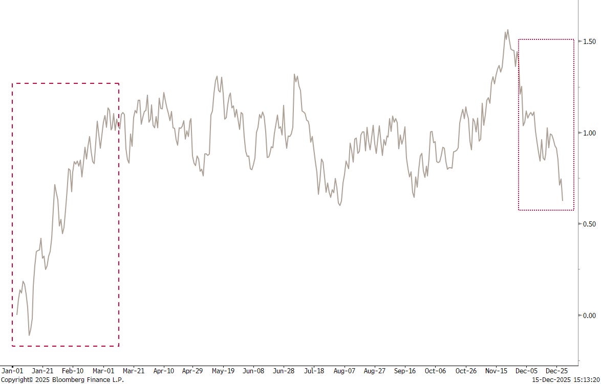 From a seasonality point of view, USD-weakness in December is not uncommon (dotted box), however, is then followed by strong seasonal tailwinds in Q1 (dashed box):