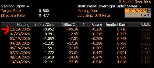 And in Japan, the market is now pricing in a rate hike this coming Friday with a 95% probability: